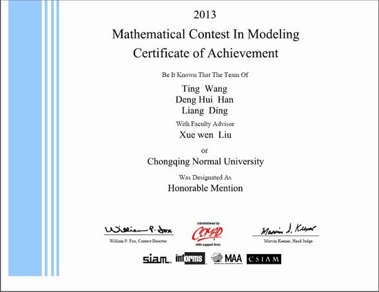 2008级计算机科学与技术(师范)刘海伟同学也曾获得美国数学建模竞赛二等奖。