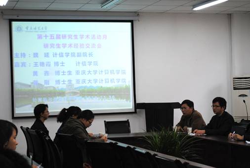会上,戴刚博士就“如何做研究”给大家作了讲解,他主要从文献的阅读与阅读、英文文章的撰写、重视理论学习以及重视与师兄师姐的交流等几个方面讲述了自己的看法与经验。接着,黄鑫博士就自己的研究领域作了“self-adaptive loops in Asynchronous cellular automata”的主题报告。随后,王艳霞博士就“如何写论文”给大家作了指导。最后,三位博士与同学们进行了互动,耐心地解答同学们所提出的疑问。交流会共持续了两个小时,通过此次交流会,大家获得了弥足珍贵的学习经验,更加明确了自己的目标与方向,增强了学习的信心与动力。