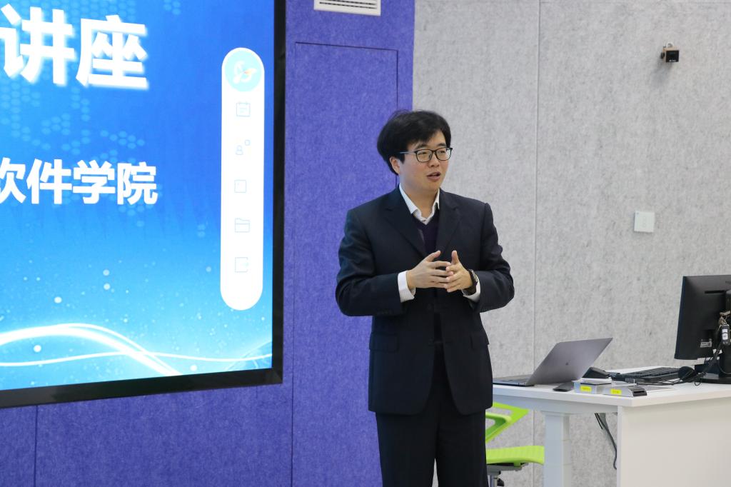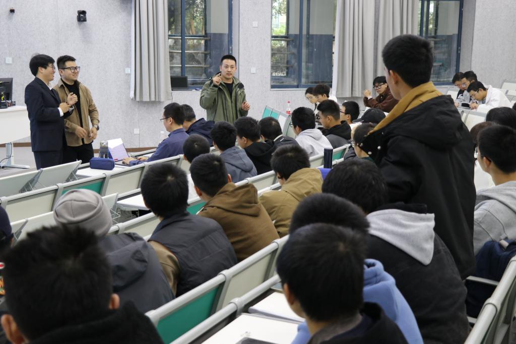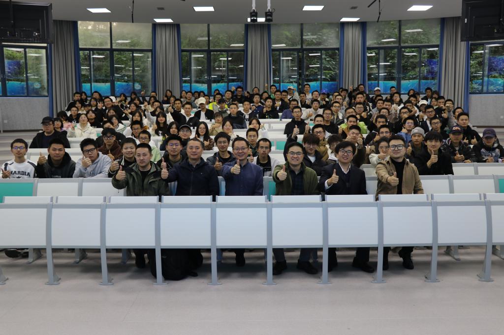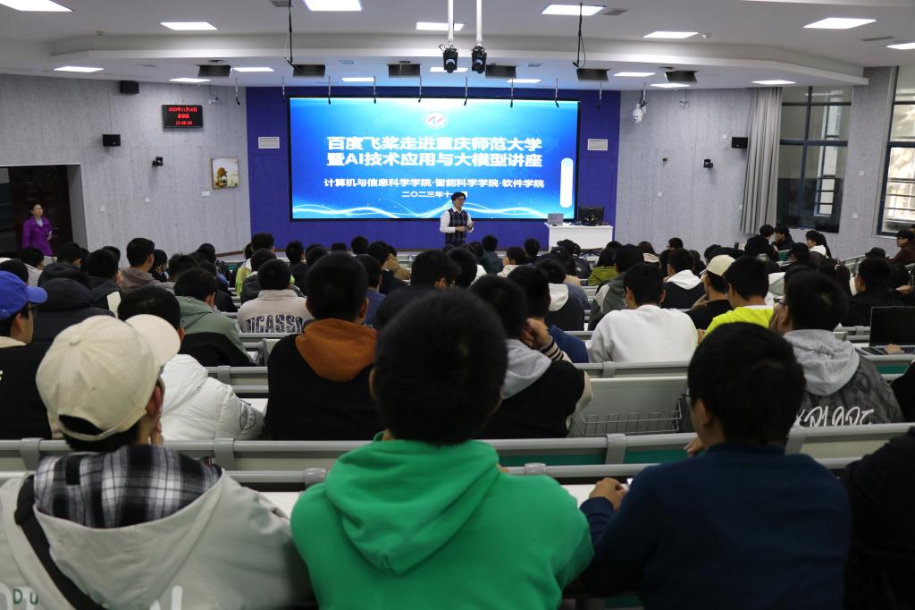 百度飞桨领航团长张青军和软件工程与智能科学专业的一百余位学生。讲座由计信成人直播平台