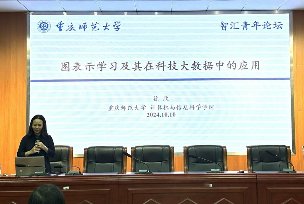 论坛伊始,桑彬彬老师分别介绍了徐欣博士和林文婷博士的学术背景、研究方向等。随后,两位博士教师围绕其各自研究方向及研究成果进行汇报。徐欣博士作题为“图表示学习及其在科技大数据中的应用”。她主要指出了社交网络、知识图谱、生物网络等真实世界建模成的非结构化数据——图网络的表示学习仍受到数据稀疏性的严重困扰,进而提出表示学习和图表示学习的研究进展,并以科技大数据为基础,将介绍图表示学习在科技数据中的应用与智能分析方面做了详细讲解。