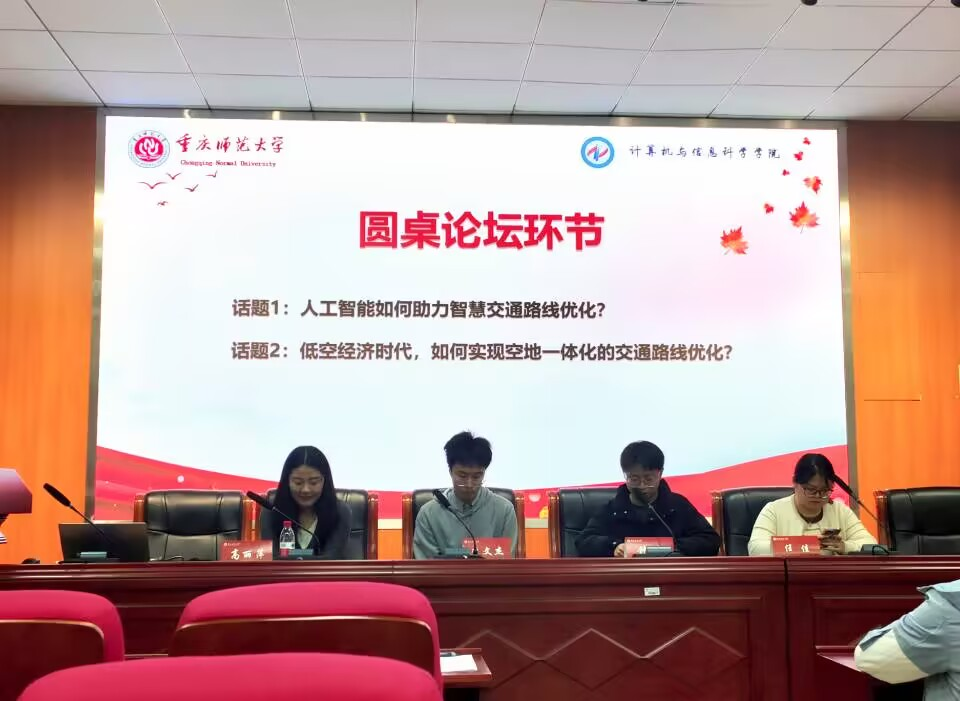 在圆桌论坛环节,主讲人与三位嘉宾围绕多个学生关注的话题展开讨论,包括“人工智能如何赋能智慧交通路线优化”、“低空经济背景下如何实现空地一体化交通路径规划”,以及“计算机专业学生如何做好就业准备”、“考公考编信息搜集与备考策略”等实际问题。嘉宾们结合自身经验,从技术前沿、学科交叉、职业发展等多个角度分享了见解与建议,为同学们提供了宝贵的参考。