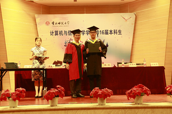 接下来,典礼进入表彰仪式。李世宏副院长为唐尚梅等27名优秀毕业生以及刘玉立等14名优良毕业生颁奖,其中张聪杰、张浩男、姚冠君、胡婕四名同学被推荐为重庆市优秀毕业生。紧接着杨德刚副院长宣读了给予第一志愿考取成人直播平台