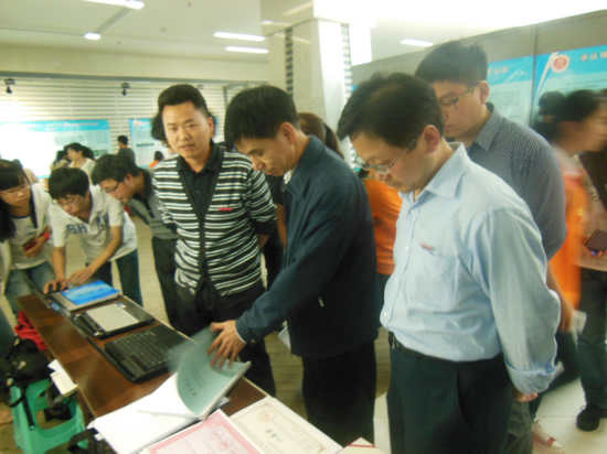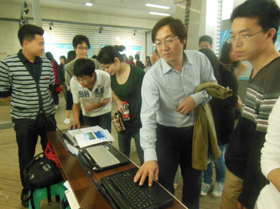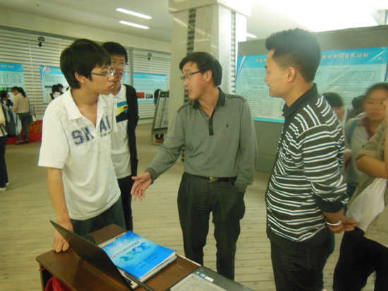 随后,校友会堂大厅进行的学生科研作品展示过程中,孔春阳副校长和其他部门领导饶有兴致的参观了成人直播平台