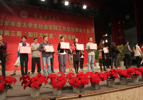 32名同学获得了“大学生社会实践先进个人”的荣誉,2012级汤泽鸿、潘文颖两位同学获得了“新生爱心志愿服务活动”的光荣称号,学校相关领导亲自颁发奖状,表彰大会在热烈的掌声中结束了。