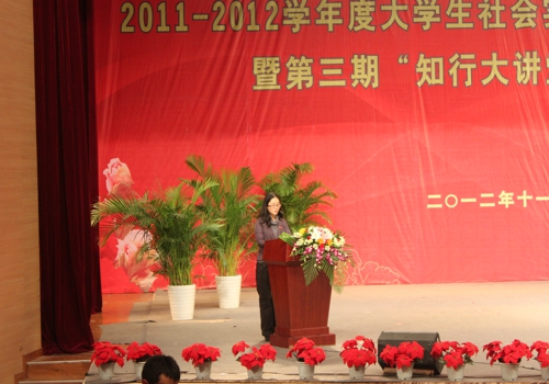我校在2012年11月1日星期四下午2:30于校友会堂演出厅举办了2011—2012学年度大学生社会实践工作总结表彰大会暨第三期“知行大讲堂”宣讲活动。校党委邓卓明书记、龚燕副书记出席,校团委、学生处、宣传部、财务处、保卫处等部门负责人,及各院学生工作队伍领导老师和受表彰集体与个人参与。