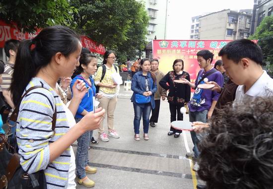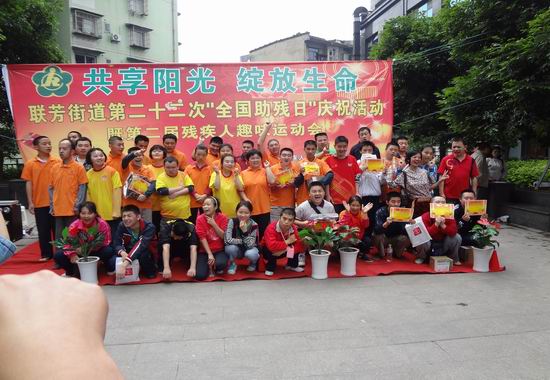 运动会的项目有篮球投射、拍篮球、打乒乓球、立定跳远、接力赛等。志愿者们分工合作,分别担任着裁判、计数员、现场秩序维护的工作。这些工作虽然简单,但是对于作为残疾人的裁判及计数员等工作并不显得那么容易。虽然有些辛苦,但是一看到他们开心的样子,志愿者们感到非常值得,非常幸福!忙了两个多小时,比赛项目接近尾声,最后主持人宣布今天的优胜团队和获奖人员,运动会圆满结束!志愿者们拍照留念,最后令志愿者们欣慰的是残疾人们送上了他们亲手制作的工艺品,志愿者们依依不舍地跟他们到了别,他们显得很舍不得的样子,志愿者们心里却有一点难过。