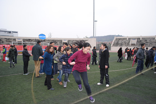 教职工队伍参与的第一个项目是蚕宝宝接力,老师们个个精神饱满,激情澎湃,脸上洋溢着笑容。随后几个项目的比赛进行中,现场掌声、笑声、观众们的“加油”声、获胜者的欢呼声此起彼伏,场上场下互动交流,整个比赛过程始终充满了欢乐祥和的气氛。最后的扒河比赛更是极富挑战,经过了第一局的比赛失利,成人直播平台