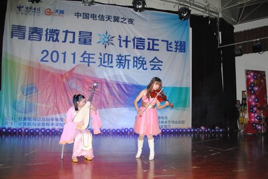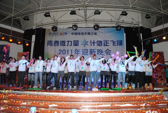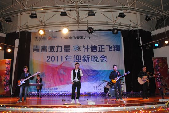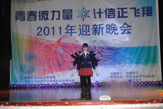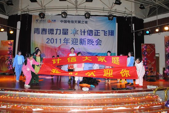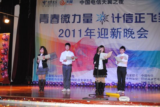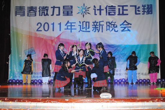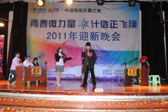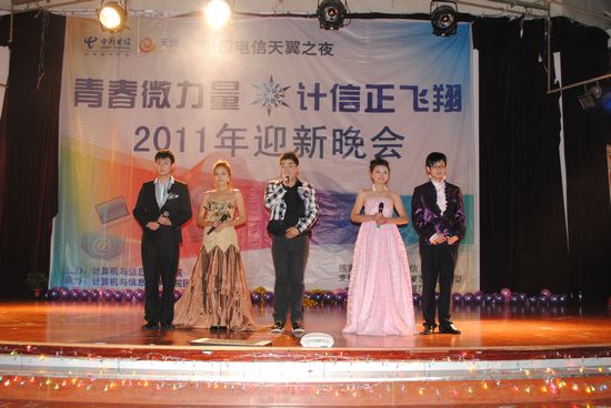 寒潮绕道去,热情洋溢来!伴着飘飞的彩带、亮丽的彩球,2011年12月11日晚上7:00,在同学们的欢呼与荧光棒的闪耀下,以“青春微力量,计信正飞翔”为主题的成人直播平台 2011级迎新晚会于校学生活动中心拉开序幕。成人直播平台 党总支书记刘军,院长马燕,副院长魏延、杨晓红,办公室主任罗世祥,团总支副书记张敬,以及全体辅导员、部分任课教师应邀出席,各兄弟成人直播平台 的嘉宾代表和成人直播平台 学子参加了整场迎新晚会。晚会由郑洪辉等五人主持。