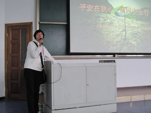 首先,朱嘉洁老师从对主题的阐释,谈有关主题的例子和如何防盗、如何减灾三大方面向同学们进行讲解。在如何防盗部分,朱老师详细的介绍了有关宿舍防盗、自行车防盗和教室防盗三方面的内容。例如出门、睡觉前确保门上锁;电器的安全使用;自行车按规定停放;不随意摆放贵重物品在图书馆、自习教室等公共场合等。提醒同学们千万不可粗心大意造成财产损失。另外,朱老师还介绍了如何减灾和灾难发生后的一些应急措施。如皮肤烫伤了怎么办;眼睛被化学物品灼伤后怎么办;衣服着火了怎么办;发生地震了怎么办;如何应对洪涝灾害;如何应对雷电天气等。让同学们获益匪浅。