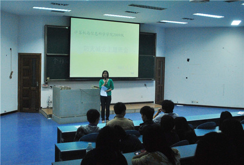 为认真做好“防灾减灾日”宣教活动各项工作,有效增强全体师生防灾意识,不断提升应急能力,提高自救、互救技能,确保财产安全,2011年5月15日下午6点,2010级计算机科学与技术1-3班在鸿德楼14404教室,4-10班在5205教室开展了以“平安在我心,校园安全行;以人为本,生命至上”为主题的“防灾减灾日”宣教活动。