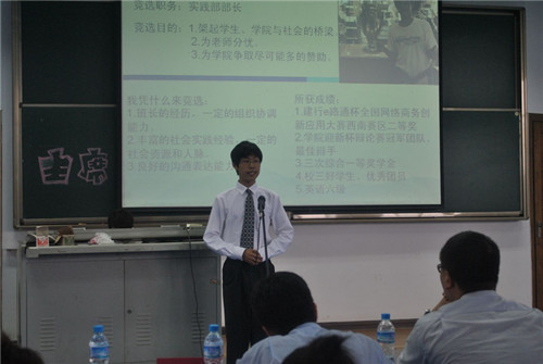 迎来了“送旧迎新,继往开来”的时刻——第二届团学会总结暨第三届团学会主席团竞选大会召开,院党总支副书记杨宇、团总支副书记张敬以及09、10级辅导员作为本次大会的嘉宾应邀出席。大会由第二届团学会主席杜斌主持。