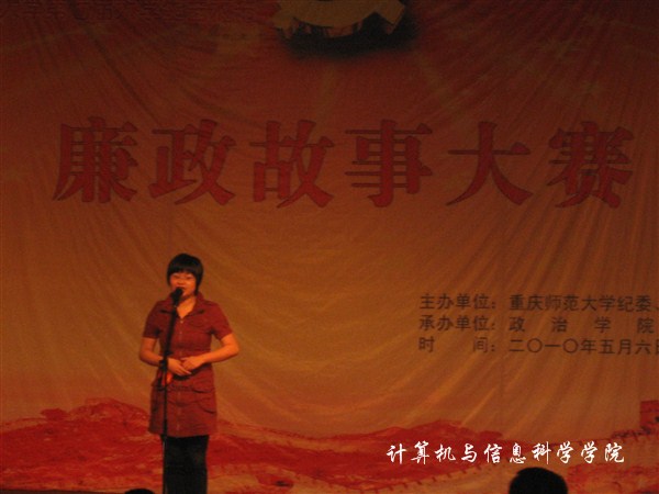 5月6日下午,成人直播平台 计算机科学与技术专业08级王露同学代表成人直播平台 参加校“廉政故事”大赛,参赛作品《神秘的保姆》讲述了一个关于官员家里老保姆的廉政故事,深得评委的一致好评,最终在18个参赛队当中脱颖而出获得了第六名(三等奖)的好成绩,展现了成人直播平台 的风采。