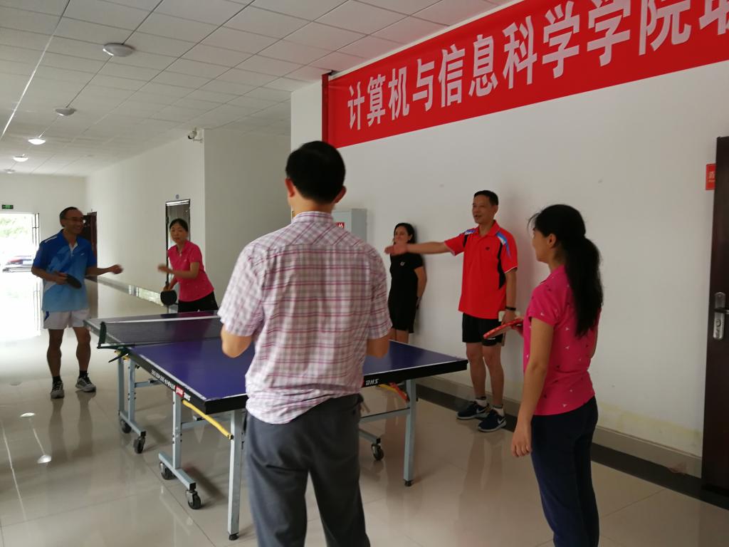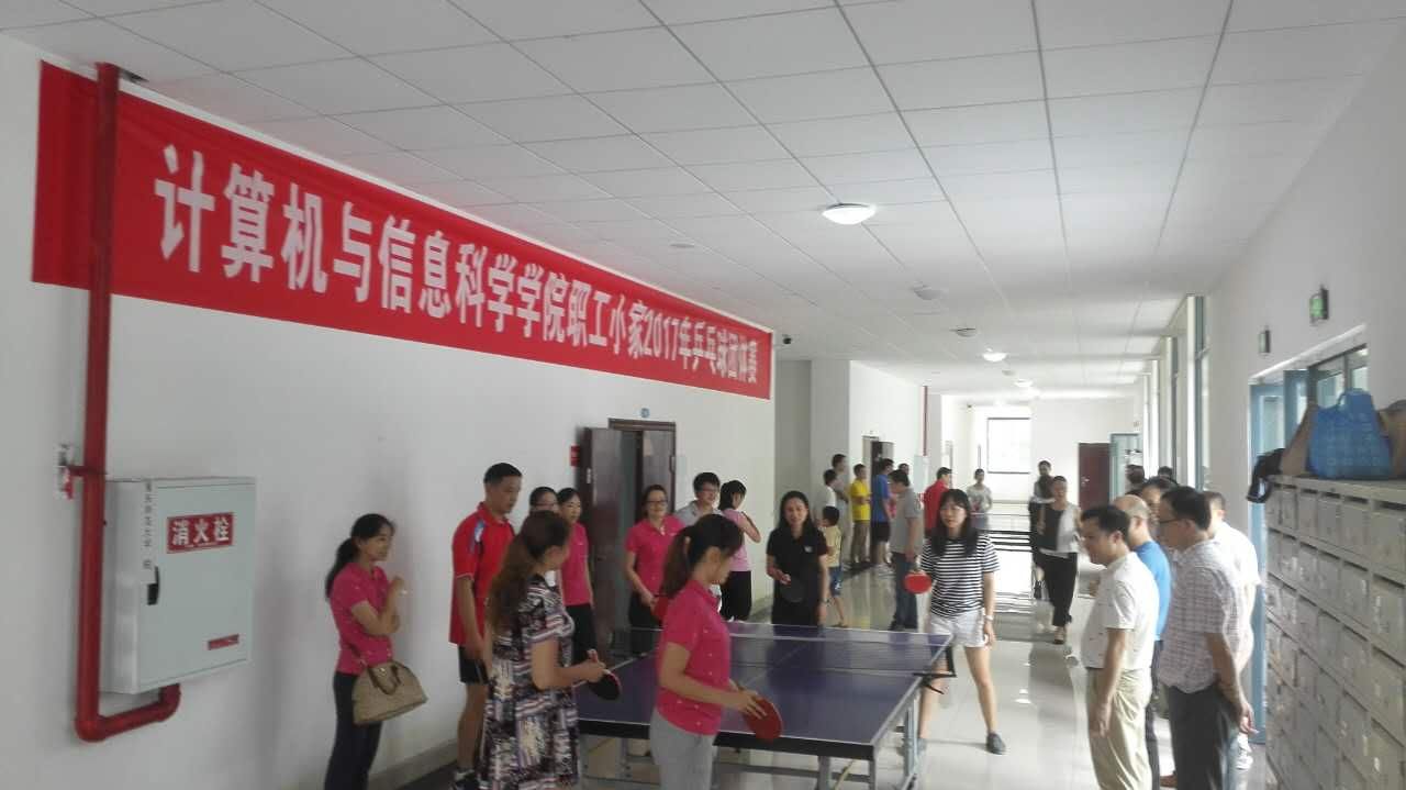 工会组织一场别开生面的“乒乓球团体比赛”活动。活动以工会小组为单位,分别由计算机科学与技术系、软件工程系和实验中心、电子商务系和信息管理与信息系统系、计算机基础系和行政小组等单位组成,上场比赛队员达到30人,占全院教职工总数近50%,其他老师则成为本单位拉拉队队员。