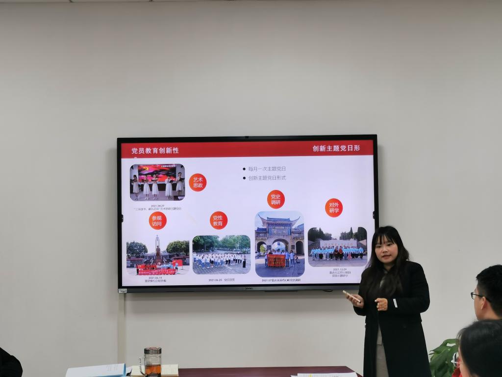 党史学习教育的开展情况,强调要将党史学习教育成果转化为促进事业发展的实际成效。接着,各支部书记围绕主题进行现场述职。学生一党支部书记郝占章结合毕业生党员教育管理实际,阐述了扎实学党史、悟思想,为毕业生办实事的情况;学生二党支部书记刘宇突出以严格规范的发展流程、丰富多元的组织生活,为支部建设和学生党员教育管理提质增效;学生三党支部书记钟华将支部党建工作与立德树人、本科生成人成才工作深度融合,打造支部亮点,创新理想信念教育模式;研究生党支部书记蒋明宇就支部常规工作、支部工作特色、不足和改进方向进行一一陈述;教工一支部书记谭华山细致总结了全年组织生活、主题党日等活动,针对工作不足,明确改进方向;教工二支部书记叶青围绕样板支部打造工作,分析了结合专业学科特色和教书育人实际,深化党史学习教育成果实践路径。