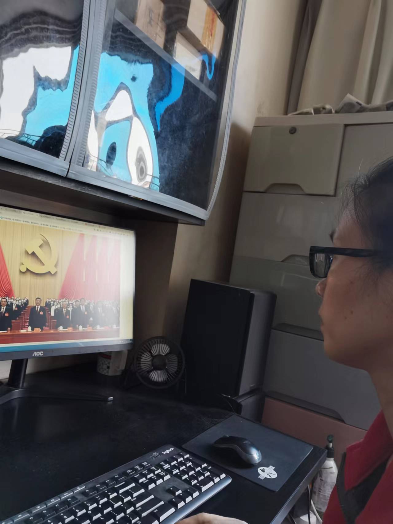 党委还组织全体留校教职工和部分学生代表于致用楼314党建活动室观看党的二十大开幕会实况。上午10点不到,师生们早早来到屏幕前收看开幕会盛况。在总书记的报告过程中,观看现场不时自发响起热烈的掌声。