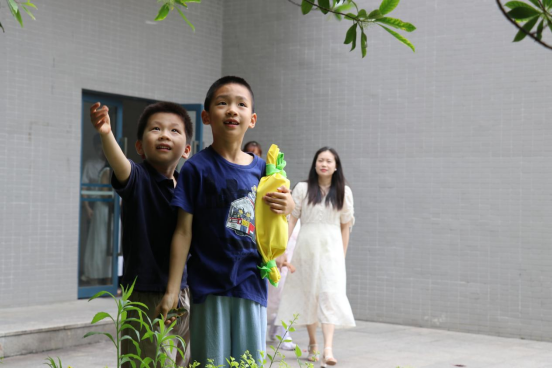 随后,活动进入亲子协作环节。“抱团大作战”游戏中,孩子们根据指令迅速组队,或紧紧搂住小伙伴,或机智地“抢”走家长加入队伍,机灵的表现引得观众捧腹大笑,既考验手眼协调,又培养了默契。孩子们的机灵劲儿让整个游戏充满了紧张又欢乐的气氛,吵闹声、欢笑声此起彼伏。手工创作环节则将活动推向高潮。志愿者引导孩子们走进校园自然区,采集花瓣、树叶等材料,通过拓染工艺制作独一无二的“植物印花手提包”。小朋友们认真聆听讲解,将花瓣排列在帆布上,轻轻敲打出自然的色彩与纹理。